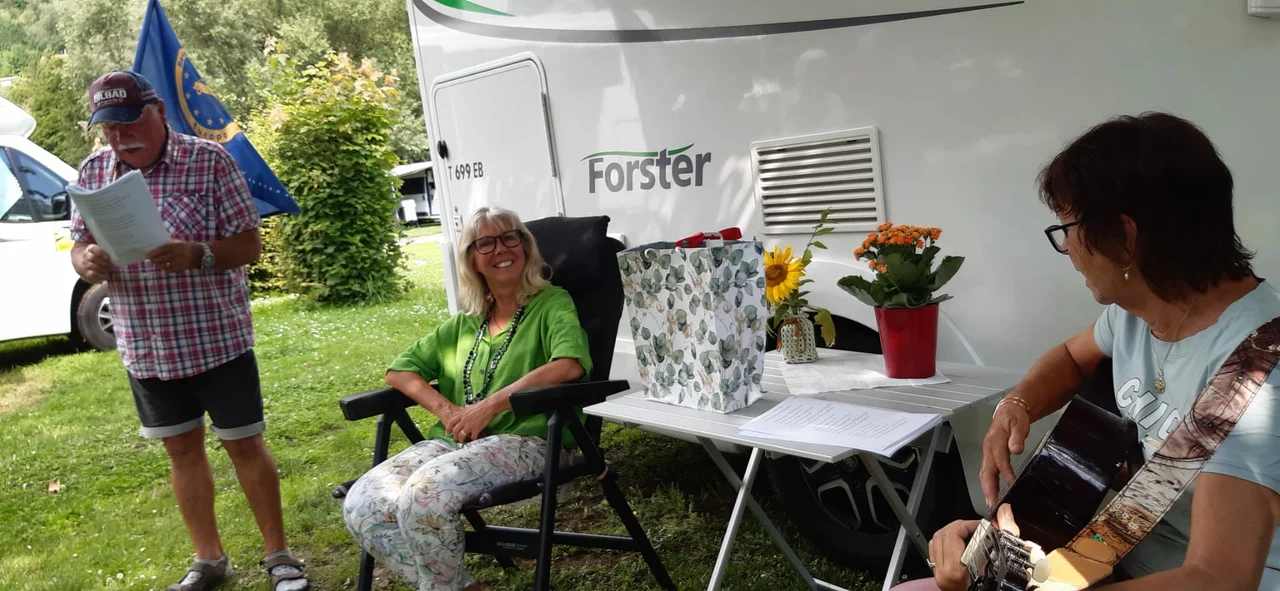 Alle 15 Fahrzeuge treffen am Freitag, 18. Juli rechtzeitig auf dem naturnahen Campingplatz Dr. Ernst Dadder in Saarlouis ein. Jeder Teilnehmer findet einen passenden Platz mit Satellitenempfang. In gemütlicher Runde begrüsst der neue Vorstand Reisen, Josef Becker, alle Anwesenden herzlich in seiner Heimat und gibt die notwendigen Informationen zum Campingplatz und dem Programm in den nächsten Tagen bekannt. Beim Briefing dankt Josef seinem Vorgänger Ricci und Irmi Ott für die tolle Arbeit, die sie 16 Jahre lang als Vorstand Reisen zum Wohle der RMF geleistet haben und übergibt ihnen ein kleines Geschenk als Zeichen der Anerkennung.